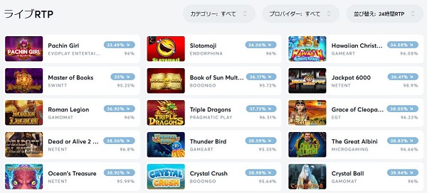 ビットカジノにはライブRTP(Return to Player)という他のオンラインカジノにはない独自の機能があります。現在進行形で調査している「現在のペイアウト率」がひと目で分かるシステムなので、ペイアウト率が高いスロットをプレイすれば勝率もアップします。