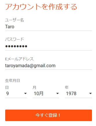 次にユーザー名(英数字)、メールアドレス、生年月日を入力します。全て入力したら、今すぐ登録をクリック。