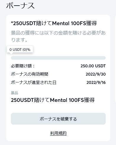 250USDT以上賭けます。Crapsは対象ゲームから除外です。USDTのみ利用可能なので、その他の通貨は対象外となります