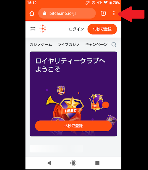 ビットカジノのサイトを開いたら、画面右上にある「…」をタップします。