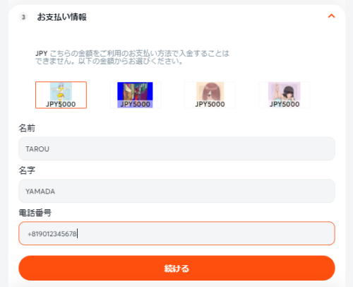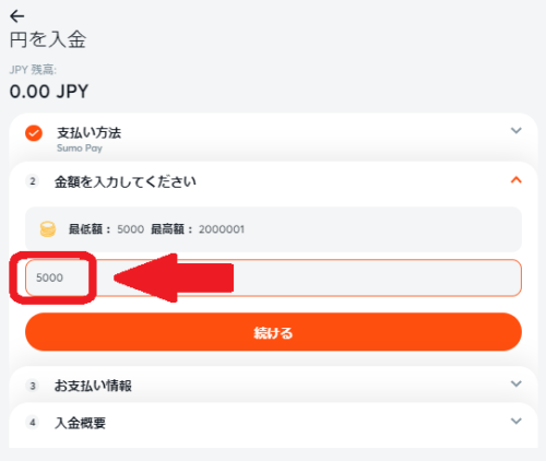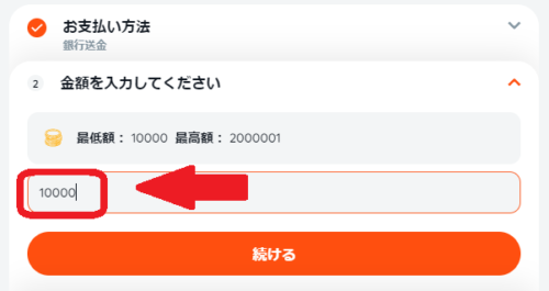 入金する金額を入力したら、「続ける」をタップもしくはクリックします。