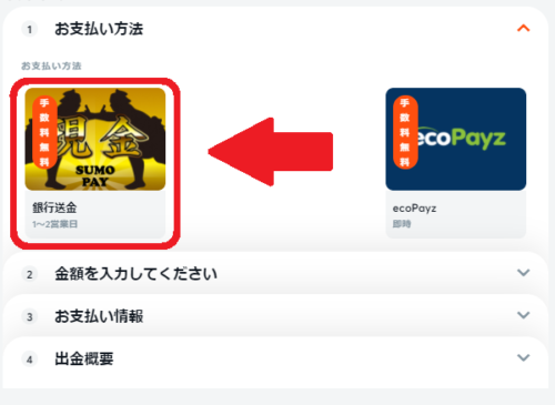ビットカジノは、仮想通貨を持っていない人やecoPayzの口座を持っていない人でも、銀行振込「Sumo Pay」を利用して入出金ができることが魅力です。