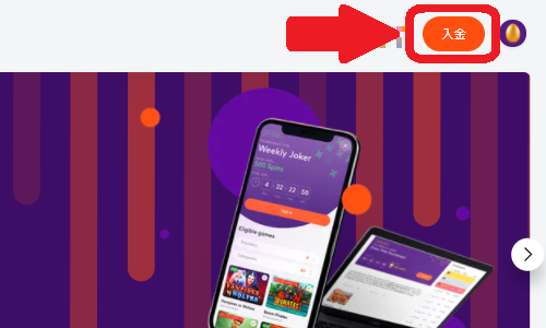 ビットカジノのサイトを開いてログインをしたら、サイト上部にある「入金」の文字をタップもしくはクリックします。
