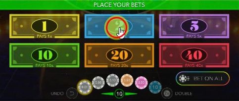 ドリームキャッチャーのルーレットは54区画に分かれています。①が23か所、➁が15か所、➄が7か所、⑩が4か所、⑳が2か所、㊵が1か所あります。数字はペイアウトの倍率を表しており、➁に賭けて、ルーレットがそこに止まると賭けた金額とは別に賭けた金額の2倍の賞金を獲得できます。また「MULTIPLIER」と書かれた区画が2か所あります(「7×」と「2×」)。そこに止まった場合はもう一度ルーレットを回し、当たった場合は賞金が2倍、または7倍になります。