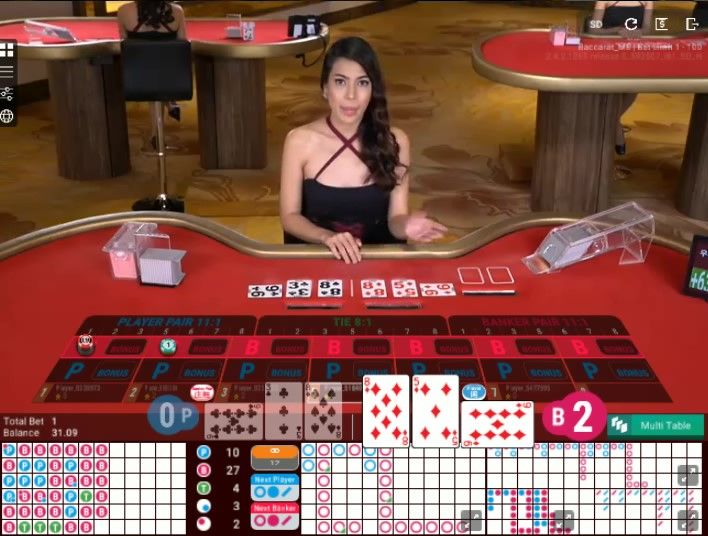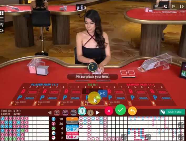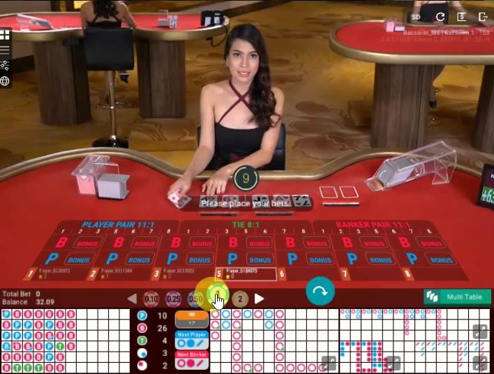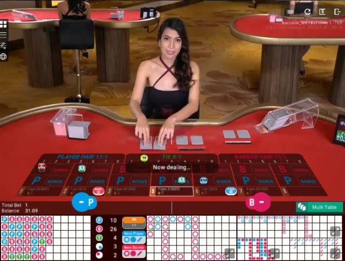 Quickfireのライブカジノには、ボーナスバカラ、ノーコミッションバカラ、バカラ、シックボー、ルーレットのライブカジノがあります。バカラのライブカジノは12ルームあります。一番左上のバカラルームを選択します。ミニマムベットは€1で、マックスベットは€100です。クリックするとプレイルームに移動します。