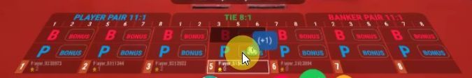 またPやBの横にBONUSと書いてあるところにベットすると、プエイヤーボーナスやバンカーボーナスに賭けることになります。本来の基本的なプレイヤー側やバンカー側とは、違ったルールの賭けになるので注意しましょう。ここでは、プレイヤーボーナスにマウスを合わせクリックしました。