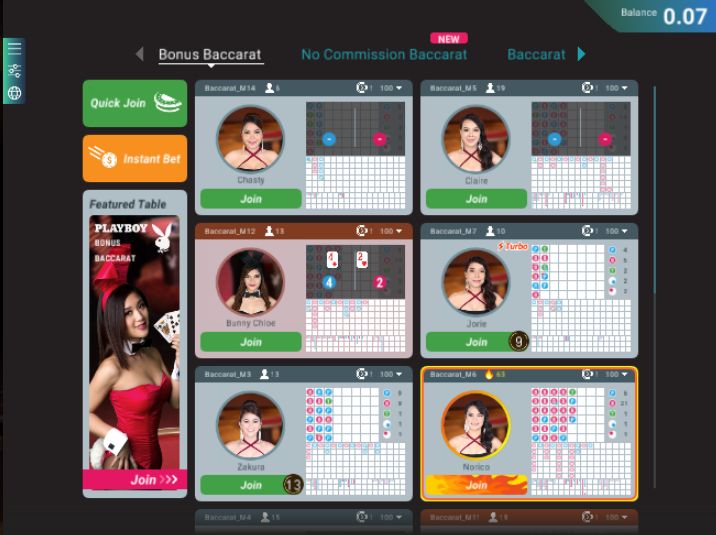 Quickfire のライブカジノには、ボーナスバカラ、ノーコミッションバカラ、バカラ、シックボー、ルーレットの5種類のライブカジノがあります。注目のテーブルはなんといってもPLAY BOYのコスチュームをまとったディーラーがいるボーナスバカラのテーブルです。ミニマムベットは€0.