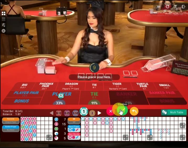 €1チップをプレイヤー側に置いた後、ベットを確定するためには、緑のチェックマークの確定ボタンをクリックします。間違えた場合は、赤い