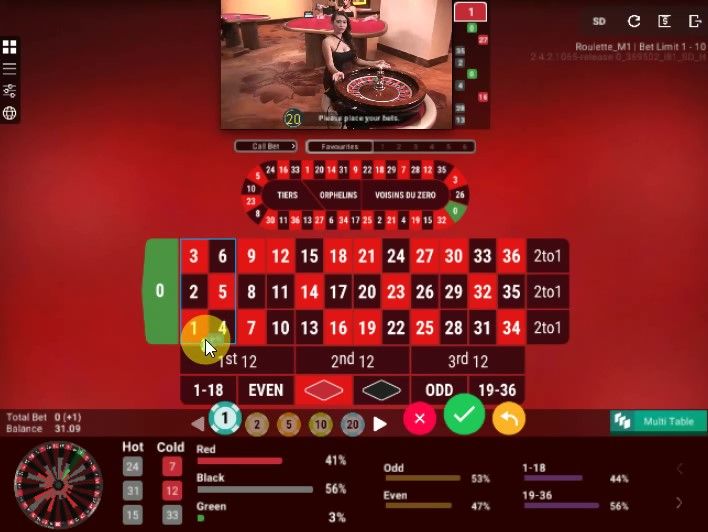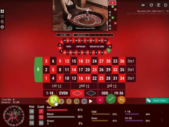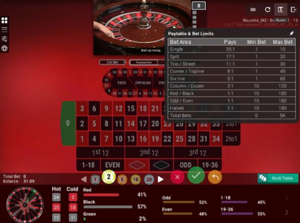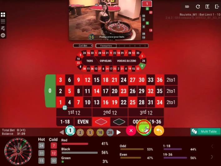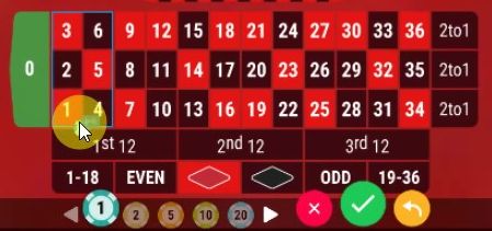 最低ベット額は、ダズンベット、コラムベット、赤/黒賭け、奇数/偶数賭け、1-18/19-36賭けでは€10になり、それ以外の賭け方では€1です。€1を最低ベット額が€10である黒に賭けて、確定ボタンを押すと、強制的に€10にチップが変わりキャンセルできないので注意が必要です。