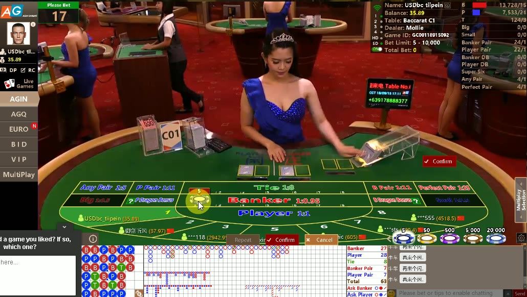 バンカーに賭けることにしました。バンカー側にマウスを合わせクリックします。そしてチェックマークのConfirmボタンで確定します。
