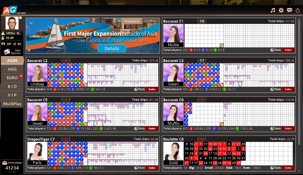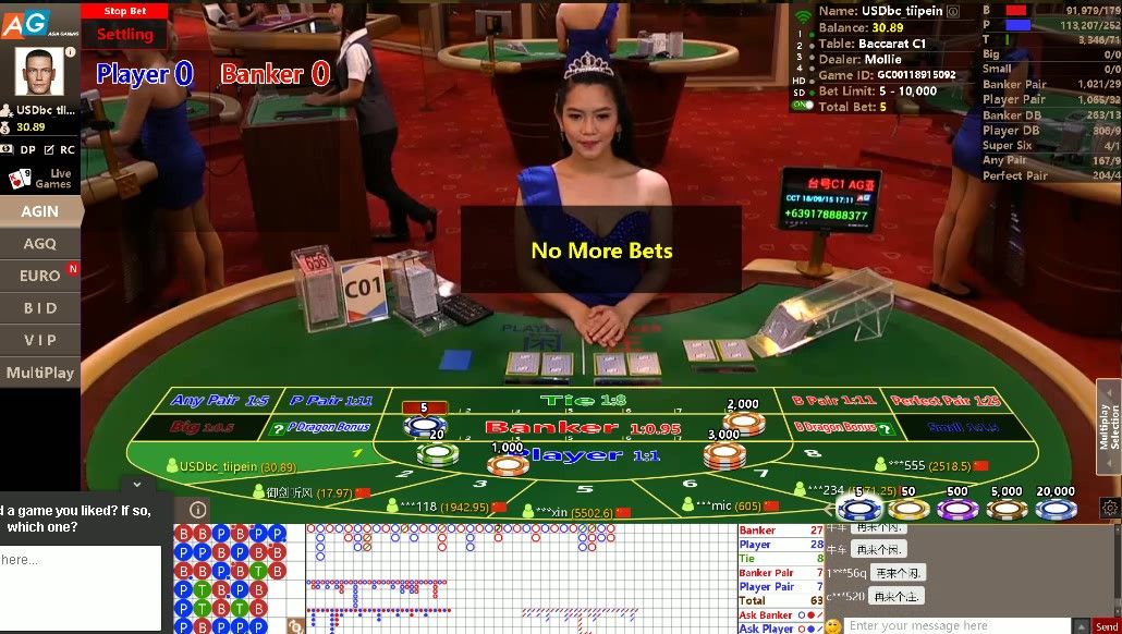 アジアゲイミングには、非常に多くのバカラルームがあります。左のタブがらAGINを選びました。VIPですと、最低ベット額が$2,000です。AGINの中にはバカラルームが5ルームあります。右上のBaccarat C1を選択します。ミニマムベットは$5で、マックスベットは$20,000です。クリックするとプレールームに移動します。