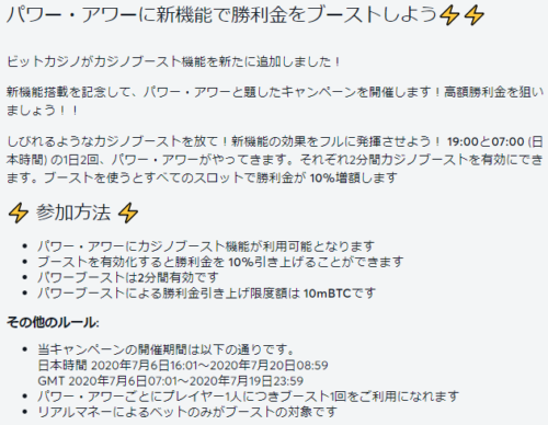 カジノブーストとは、指定の時間の勝利金を上乗せできる機能です。ビットカジノでは2020年7月からカジノブースト機能が登場しています。