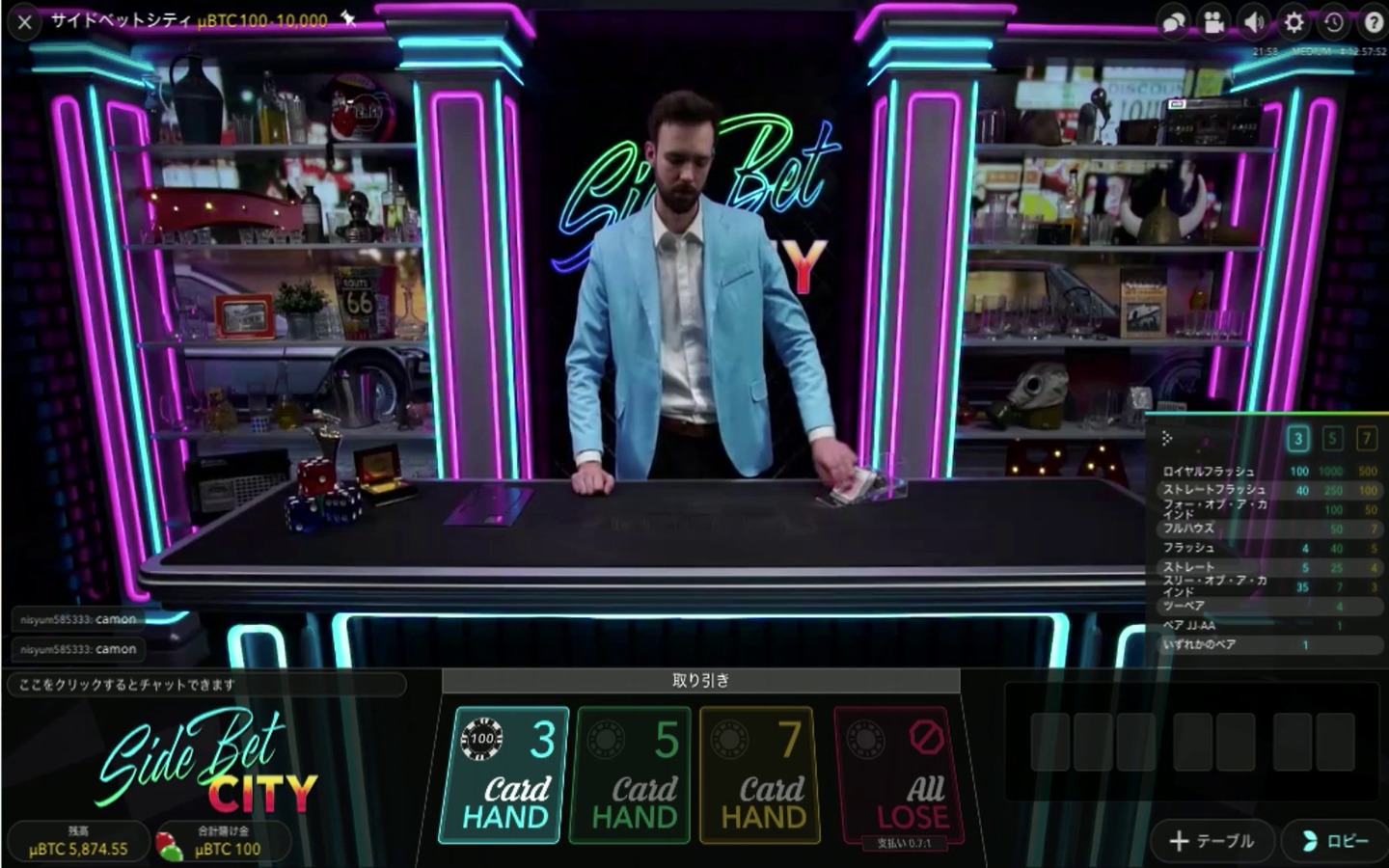 サイドベットシティは3カードハンド、5カードハンド、7カードハンドにベットするか、