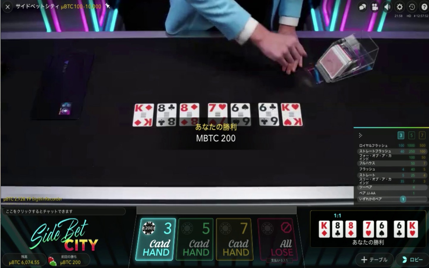 最初の3枚のカードで8のペアができたため、2倍の配当を獲得しました。その結果、100uBTCの勝ちです。