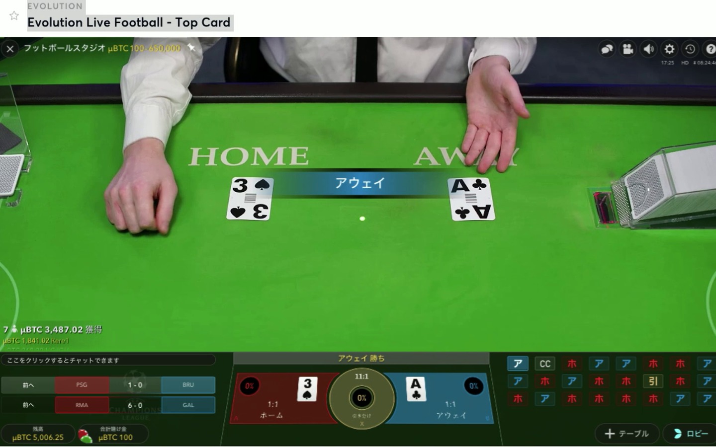 アウェイがAceでホームが3ですのでアウェイの勝ちです。ホームに賭けたので、uBTC100負けました。