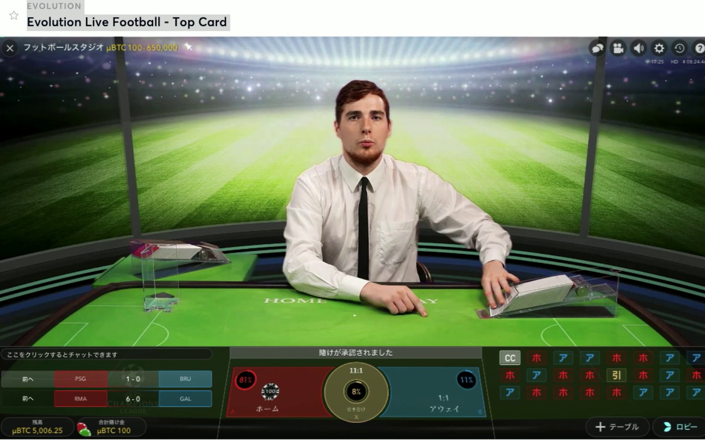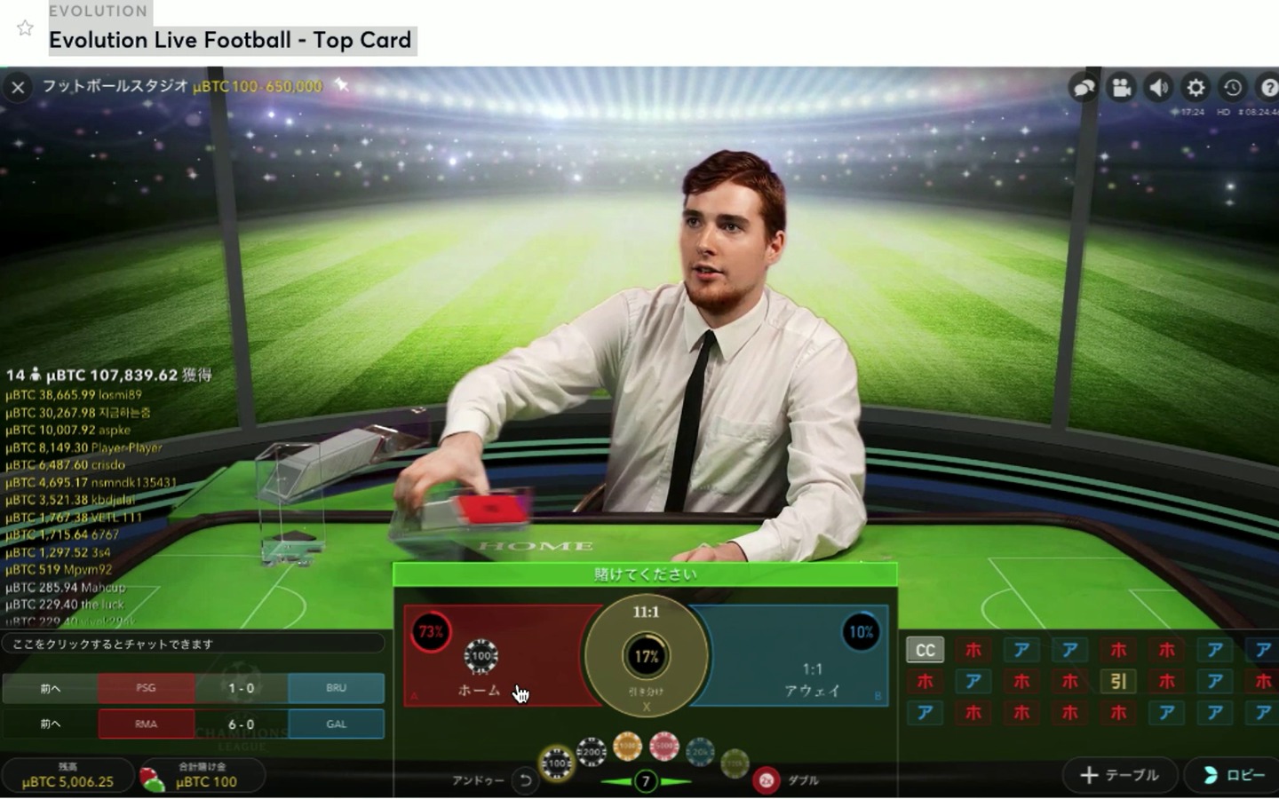最小ベット額はuBTC100で最高ベット額はuBTC650,000です。フットボールスタジオはサッカーの試合が行われていれば、観戦しながら遊ぶことが可能です。