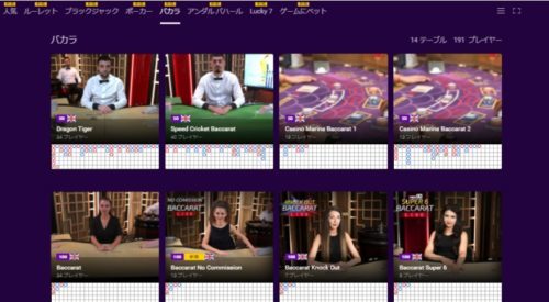 バカラの種類も豊富で、「Baccarat Knock Out」「Baccarat Super 6」などの珍しいライブバカラでも遊べることが特徴です。