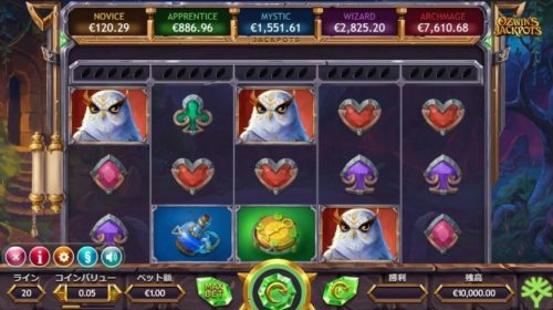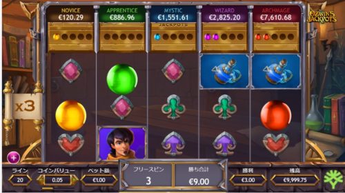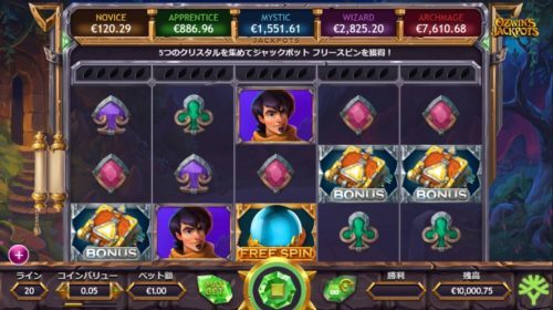 ジャックポットは、配当額が低い順にNovice、Apprentice、Mystic、Wizard、Archmageとなっています。ジャックポットは、フリースピン中に同色のオーブを5つ集めると獲得です。